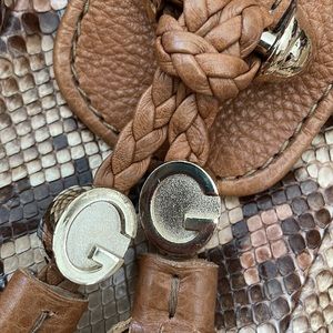 This Gucci Marrakech hobo is crafted from exotic python skin and leather. It features a flap closure and a well-sized leather interior. The bag is finished with tassel detailing on the front and two top braided leather handles; and overall, it has a beautiful appeal.