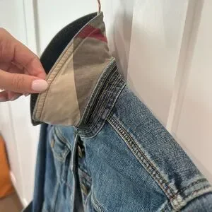 Classic Burberry denim jacket. Features button and top clasp closure and signature stitching. Cropped fit. Classic plaid design on back of collar.