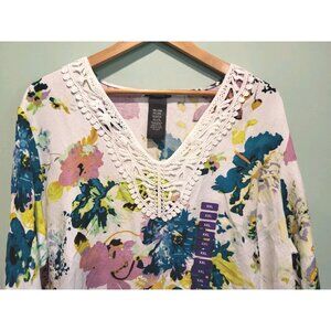 New Multicolor Floral Linen Blend V Neck 3/4 Sleeve Tunic Top Sz 2X