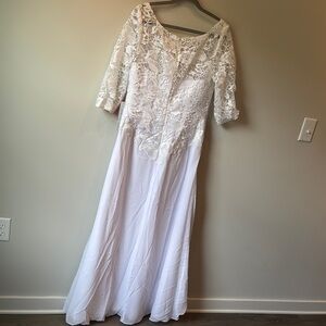 This stunning white wedding dress by JJs House features an elegant asymmetrical ruffle design with small pleat detailing. The gown is adorned with 1/2 sleeves and a sweeetheart illusion neckline, creating a graceful silhouette perfect for a bride's special day.