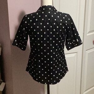 This crisp and structured black button down shirt from Talbots features a classic notched collar and short sleeves, making it a versatile addition to any wardrobe. The white polka dot pattern adds a touch of elegance to this timeless top.