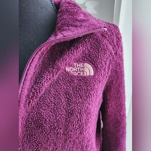 This is a pre-owned, women's The North Face Osito full-zip fleece jacket in purple. It features a high-pile, soft fleece material for warmth and comfort, a stand-up collar, zippered hand pockets, and the embroidered pink North Face logo on the chest and back shoulder.