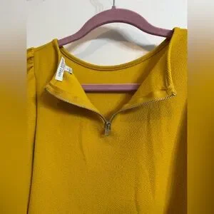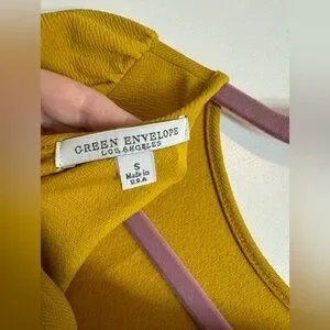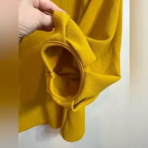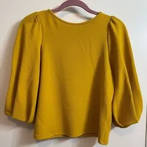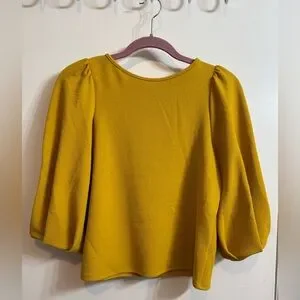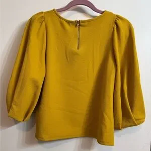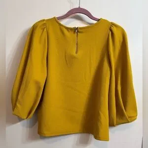 Green Envelope Los Angeles balloon sleeve top size small. Back zipper neck works smoothly. Mustard color. Puff sleeves are not elasticized. No damage, no stains. Stretchy polyester spandex blend. Measurements: pit to pit 18” across and will stretch to 21”, length 21.5” Tags: bubble casual dressy work office quirky fun comfort boss babe accessories shirt blouse Autumn fall foliage photos instagram apple picking pumpkin rustic