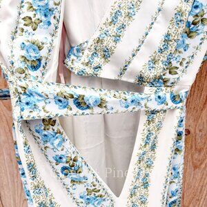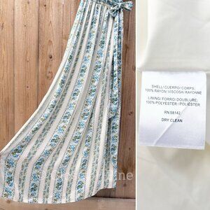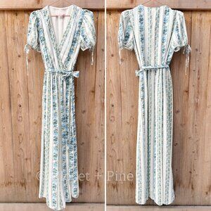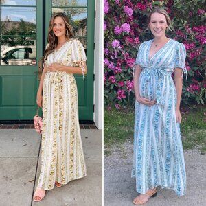 Features: maxi length, modified wrap style, short puff sleeves with tie detail, surplice v-neckline, floral vertical stripes, off white ivory with French blue and green flowers, fully lined, side seam pockets, can be worn as maternity dress as shown in photo with Julia Engel Berolzheimer in the yellow print version