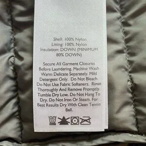 Shell & Lining 100% Nylon, Insulation DOWN (Minimum 80% Down). Not bulky.