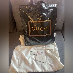 Brand: Gucci model: Montecarlo tote origin country: Italy handbag silhouette: Top handle;tote occasions: Everyday;fall/winter;spring/summer;weekend;work size generic: Large interior material: Canvas interior color generic: Black handbag closure type: Open top handbag accessories: Dustbag;other exterior color generic: Black;gold exterior material generic: Coated canvas length: 14. 50 in height: 16. Zero in handle drop: 4. Five in.Brand New.Dust bag,certificates included.