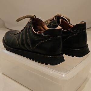 Black leather with contrasting cream stitching and laces
