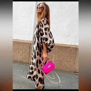 Elegant animal print dress paired with a bold pink bag. Perfect for a stylish outing.