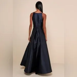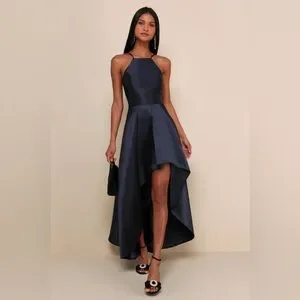 Elegant navy high-low dress by Lulu's. Features a sleek halter neckline. Perfect for formal occasions.