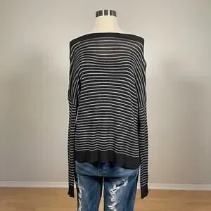 Features: Dark and light grey striped long sleeve top, semi sheer, darker ribbed trim, can be worn as boat neckline or off the shoulder