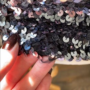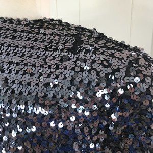Flaws: One area of missing sequins at the back shoulder and at back hem. There are extra sequins on the inner seams that could be used to repair the areas if desired. There are a few stray threads, may be more sequins missing, but none are noticeable.