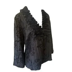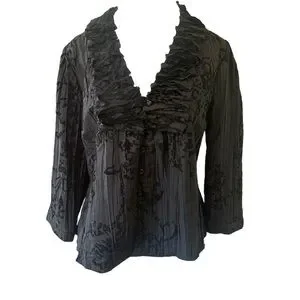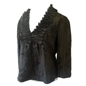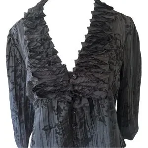 The Harve Benard Women Top in size L is a stylish and versatile piece perfect for various occasions. Made of crinkle satin with ruffle accents, this goth glam romantic whimsigoth top features a V-neckline and button closure. With a hint of vintage flair and a touch of sheerness, this lightweight top is perfect for summer, fall, and spring. Its black color and eclectic theme make it a standout piece that can be dressed up or down for a party, cocktail event, or casual outing. Perfect for those who embrace art, steampunk, and a gothic aesthetic.