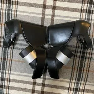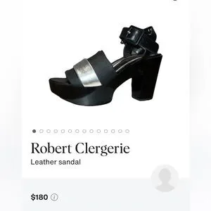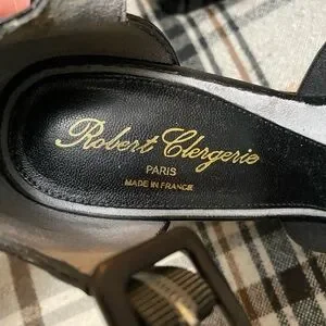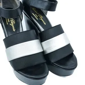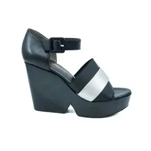 Experience the modern elegance of Robert Clergerie's black and silver wedge sandals. These shoes feature a sleek black leather upper with a striking silver accent, offering a bold yet sophisticated look. The substantial wedge heel provides both height and comfort, making them perfect for any stylish occasion. With an ankle strap and buckle closure, these sandals ensure a secure and fashionable fit.