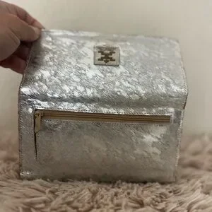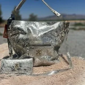 This is cowhide leather treated with an acid wash process to create a metallic, speckled, or distressed effect, often with shiny silver tones on a natural hide background. Each hide tends to look unique.