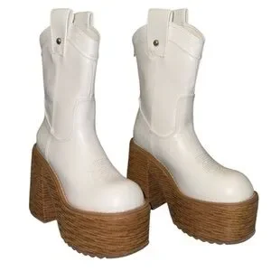 These lightweight, heeled platform cowboy boots have a vegan leather construction, western detailing, and back zipper closures. **sold out on their website