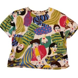 Zara printed tee in size Small. No rips or stains on front or back of shirt. Small rip on inner seem of shirt. Inner tag cut off but shirt feels cotton material.