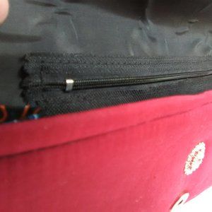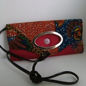 Multicolor Printed Fabric Shoulder/Clutch Hand Bag burgundy color bottom half with a silver hardware