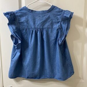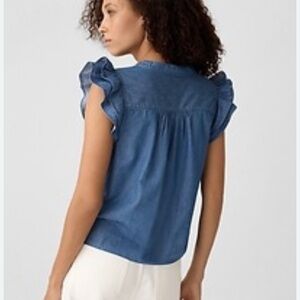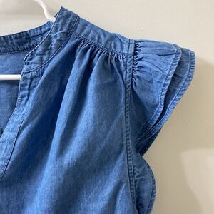 Stylish chambray blue top with playful ruffle sleeves. Perfect for everyday wear.