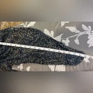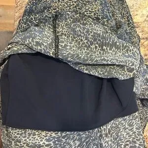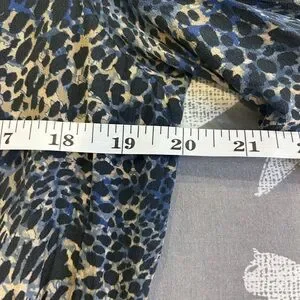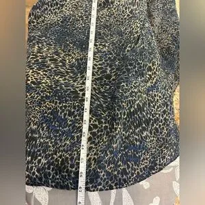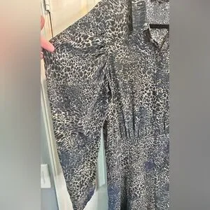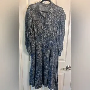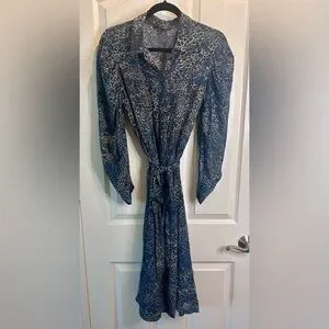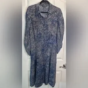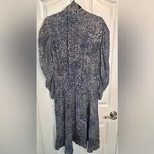 Luxury Kobi Halperin 100% SILK lined collared MIDI dress in a blue and black and cream animal print, peek a boo button front, elegant bishop sleeves, make it perfect work or dressy occasions. Very Lightweight. Includes a belt but the loop holes have been removed. Its long sleeves and relaxed fit provide a stylish yet comfortable look. The dress has a simple design ensuring a timeless appeal.