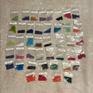 A vibrant collection of assorted craft beads. Includes a variety of colors for creative projects. 43 bags of small beads, each bag a different color.