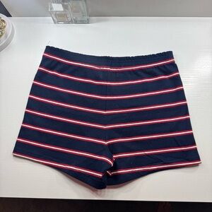 Navy shorts featuring bold red and white stripes. Ideal for casual outings.