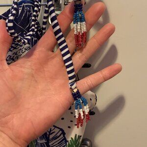 Colorful print in shades of blue, white, red, and green.