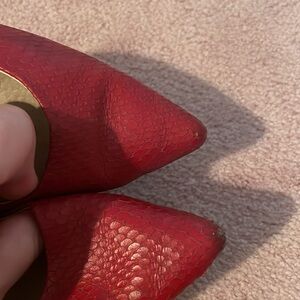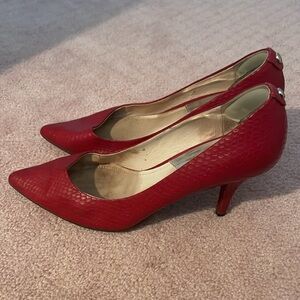Michael Kors snake skin pattern heels. Size 6.5M. There is discoloraton on the insides of the shoes at the ball of the foot and scuffing on the tips and the heels. These shoes have damage but are still functional - priced accordingly. NO RETURNS.