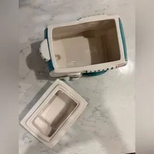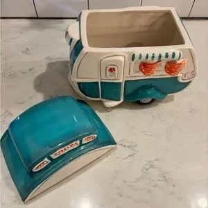 Charming ceramic camper toy in teal and white with orange accents. Perfect for imaginative play and decoration. Super cute whimsical cookie jar!