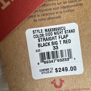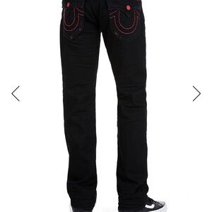 Authentic True Religion men’s jeans. Black with red stitching, brand new with tags, and ready to ship ASAP. Feel free to shoot me any questions.