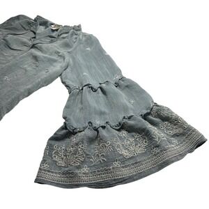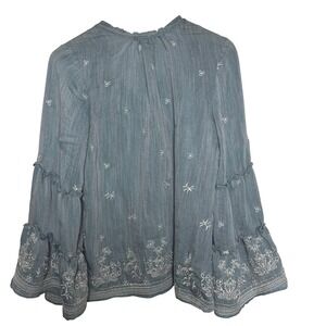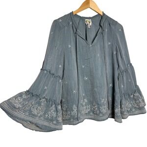 Fig and Flower Anthro Embroidered Blouse Bell Sleeve Boho Blue Gray Top Large L