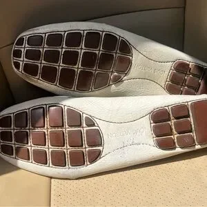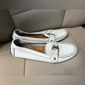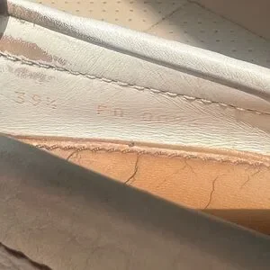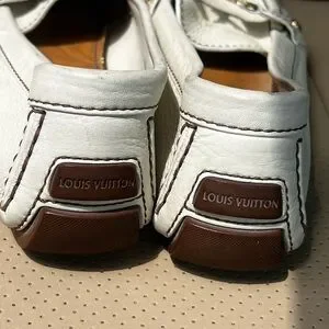Chic cream loafers with iconic gold LV emblem. Ideal for a sophisticated touch.
