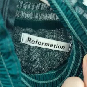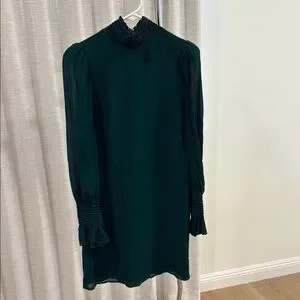 This sophisticated emerald sheath dress by Reformation is perfect for a wedding guest or cocktail event. It features elegant bishop sleeves and a mock neck with a mandarin collar, offering a refined and timeless look. The dress's minimalist design and fitted silhouette make it a versatile and stylish choice for any formal occasion.