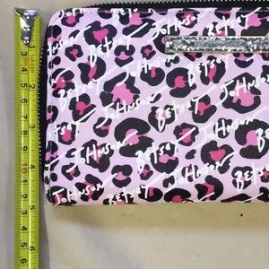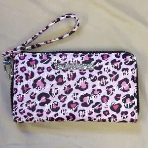 This chic Betsey Johnson wristlet features a playful pink leopard print on a smooth, durable material. The compact design is perfect for carrying essentials, and the convenient wrist strap adds a touch of practicality. Ideal for adding a pop of color to any outfit.