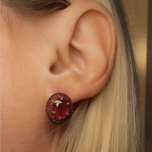 These exquisite 14k White Gold over Silver Red Ruby earrings showcases Sparkling Red “Pigeons Blood Burma Rubies” in a sleek and elegant design with the Oval center Ruby surrounded with several small round red Ruby Gemstones.