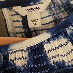 This relaxed-fit blouse by Sonoma features a smocked design in a refreshing blue and white color scheme. The blouse offers a comfortable and stylish look, perfect for casual outings. Its smocked detailing adds a touch of elegance to the overall relaxed style.