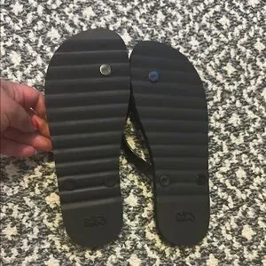 Stylish black flip flops by Coach. Ideal for casual wear. Comfortable and chic.