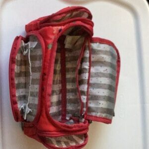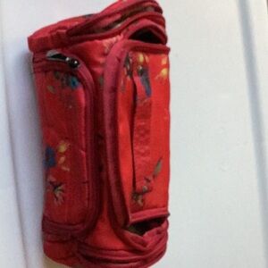 Vibrant red cosmetic bag with floral pattern. Compact and stylish. Ideal for travel.