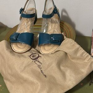 Beautiful teal sandal with 1.5 inch block heal. Adjustable straps at ankle and toes. Classics.