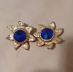 Big Gold Sunshine Clip Earrings With Blue Stone