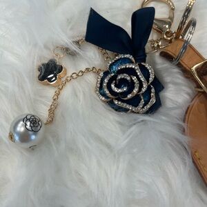 Add a touch of luxury and personality to your bag with this authentic Louis Vuitton natural Vachetta leather luggage tag, made in France. This piece is in excellent condition and features beautiful honey patina and iconic LV craftsmanship. It’s paired with an unbranded floral charm accessory featuring gold-tone hardware, a navy ribbon, and elegant accents like a pearl charm and glitter flower—perfect for elevating any handbag, luggage, or keychain with extra flair and charm.