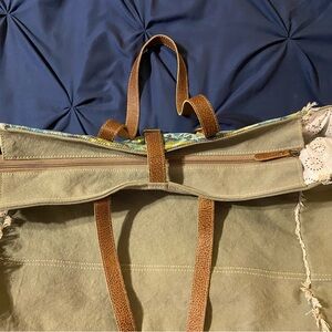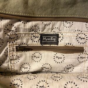 Lovely gently preowned Myra large canvas weekender bag in good condition. Interior features one small zip pocket and two open pockets. There is one side open pocket. The back has a zip compartment. The bag is a zip top closer and single button closure.