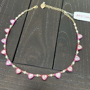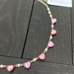 This elegant Betsey Johnson necklace features charming heart-shaped pendants in vibrant pink, complemented by luxurious gold accents. Perfect for adding a touch of romance to any outfit. New with tag.