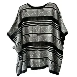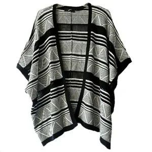 This lightweight cardigan is a ruana style and has a black and white geometric pattern sb#16