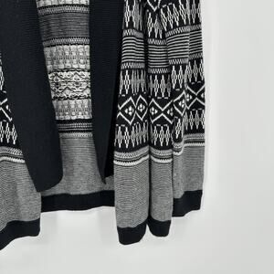 Classic open front cardigan with black and white geometric Fair Isle pattern throughout