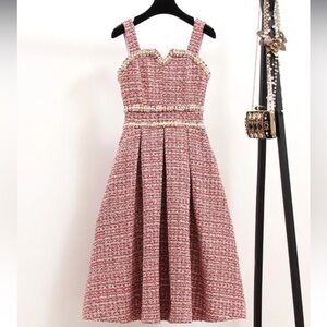 Chic, elegant pink tweed midi dress, with a matching jacket. Great for any dressy occasion or work. Thick material. Never worn before.