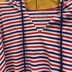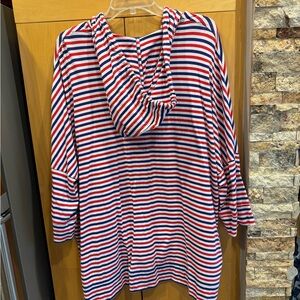 Vibrant red, white and blue striped beach hoodie. Features UV protection!!