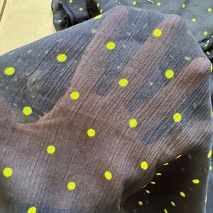 Adorable navy blue sleeveless blouse from Hollister, featuring a neon green polka dot print and a feminine front bow detail. Lightweight and sheer fabric, perfect for layering or summer days. Ruffled sleeves and subtle pleats at the bust add charm. Size L (Large).