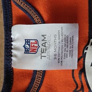 Excellent condition, no rips, stains, or holes. Orange 3-6 month short sleeve onesie with Denver Broncos logo on the front. Says "Broncos Football with Attitude". Two snap closure. Lapped shoulder seam for easy dressing.