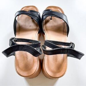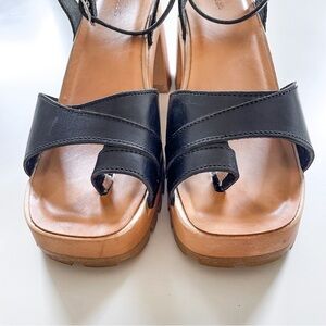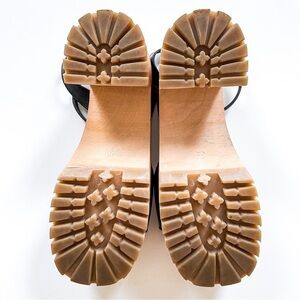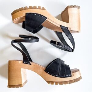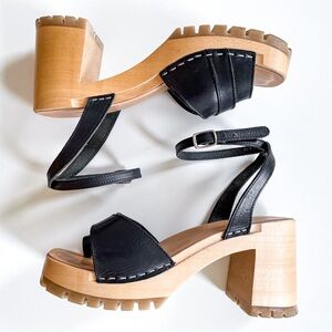 This listing is for a pair of chunky heeled sandals by Swedish Hasbeens. This style is called "The Toe Strap Sandal" and features a leather toe ring, slingback ankle strap, stacked wooden heel, and lug soles. These sandals are primarily made of wood with black leather uppers and rubber soles. Swedish Hasbeens are well know for their trendy designs and high quality footwear. These sandals have been gently used and are in great condition with minimal normal signs of wear. They are an EU 39 which is equivalent to a US women's size 8. The heel measures just under 3.5 inches tall.