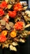 It is adorned with deep rust and brown eucalyptus stems and leaves, orange mums, and real pine cones. It is finished off with an elegant suede tan bow accented with orange embossed floral ribbon.